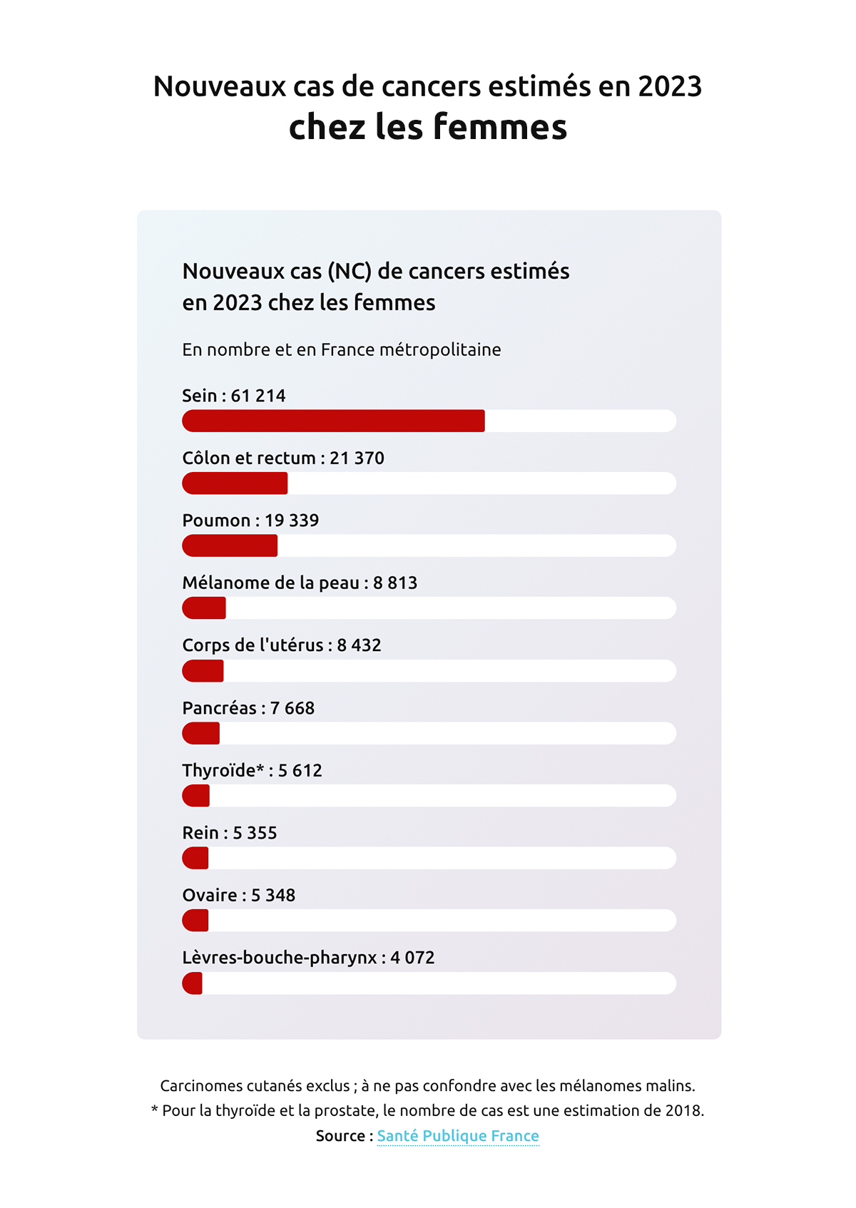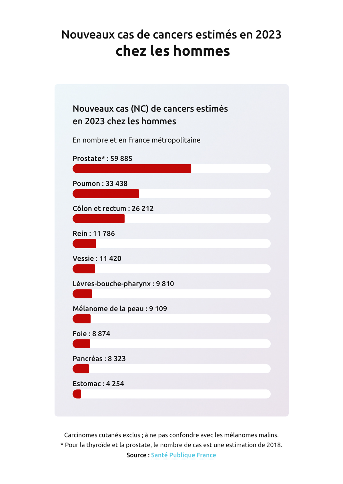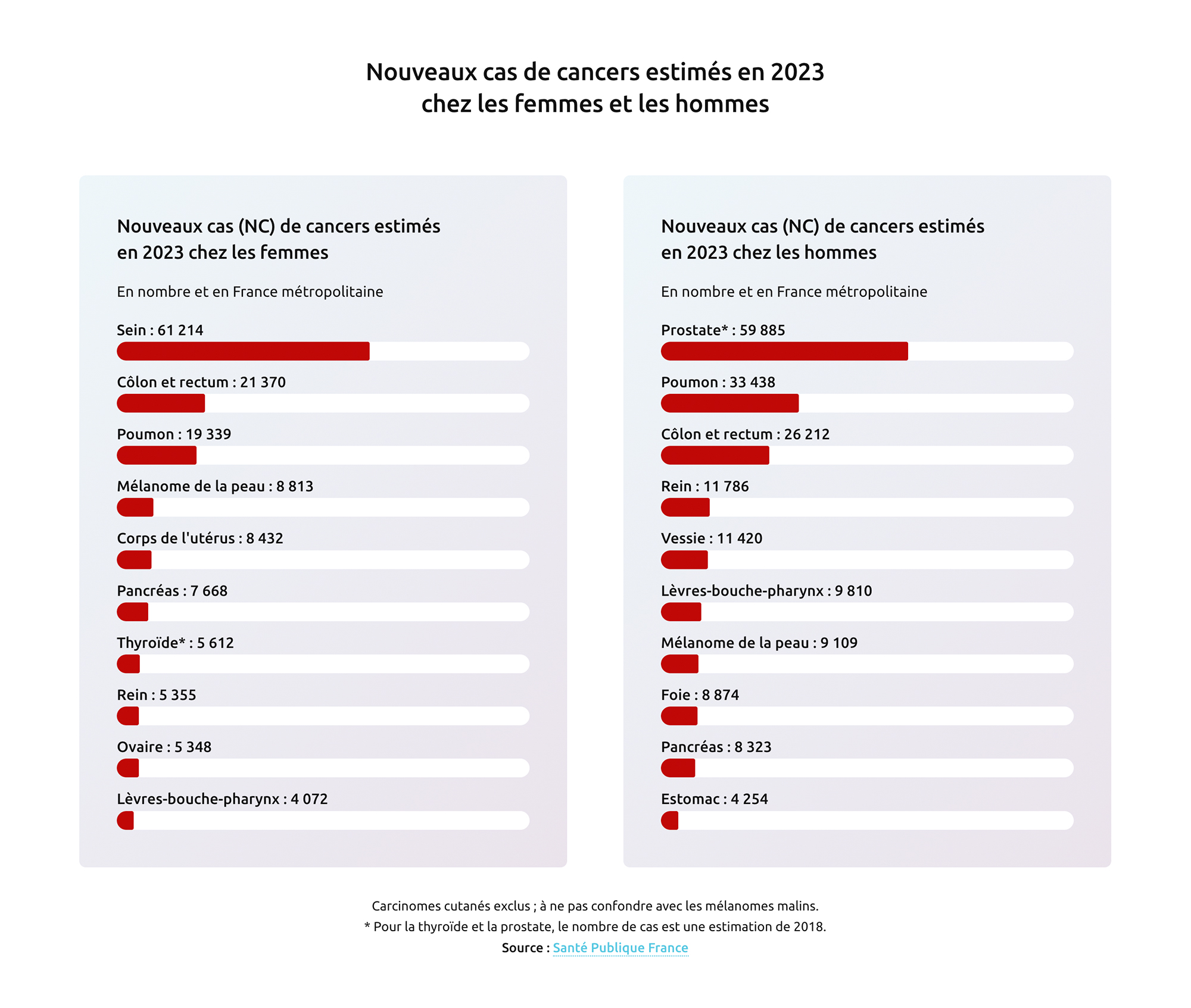 En 2023, environ 433 000 nouveaux cas de cancer ont été dépisté en France (57 % chez les hommes, 43 % chez les femmes), avec un âge médian au diagnostic de 70 ans chez l’homme et 68 chez la femme. Depuis 1990, le nombre de cas a presque doublé, notamment à cause du vieillissement démographique. Le taux d’incidence (TSM) augmente pour certains cancers comme le poumon et le pancréas chez la femme. La mortalité par cancer diminue globalement, sauf pour le pancréas. Les cancers à bon pronostic incluent la prostate et le sein ; ceux à mauvais pronostic incluent le pancréas, le foie et le poumon.